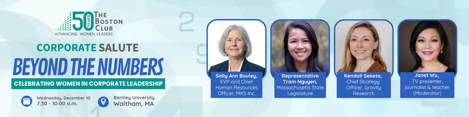 For 50 years, The Boston Club has championed women’s leadership across business, nonprofit, and civic sectors – helping to open boardrooms and C-suites, elevate voices, and expand opportunities for women throughout Boston and beyond. As part of our 50th Anniversary, we are reconfirming our commitment to women leaders and envisioning a world where women’s leadership knows no bounds.